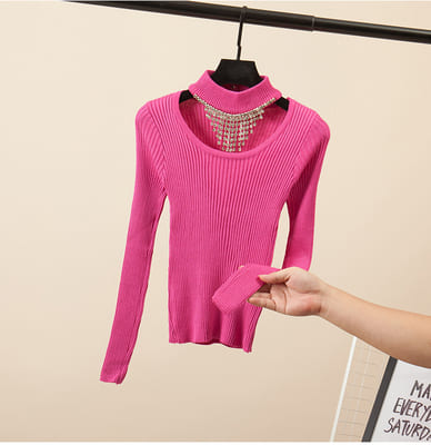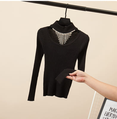 Vous allez adorer ce magnifique pull bijoux de chez Lila Fashion Strass, avec son collier strass intégré au col et sa coupe cintrée. A porter avec un de nos pantalons et des escarpins,