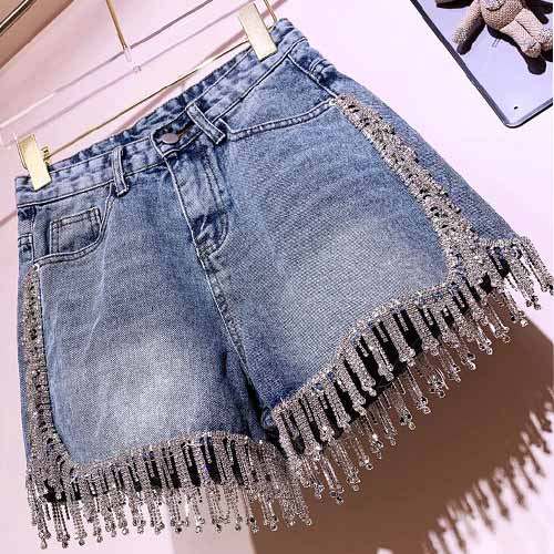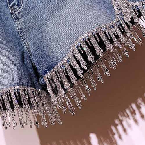 Craquez pour ce short jean avec ses franges strass de chez Lila Fashion Strass, idéal à portez en été, ce short jean est très tendance avec sa coupe mom et ses franges strass, ira parfaitement .avec un tee-shirt ou bien un crop top.